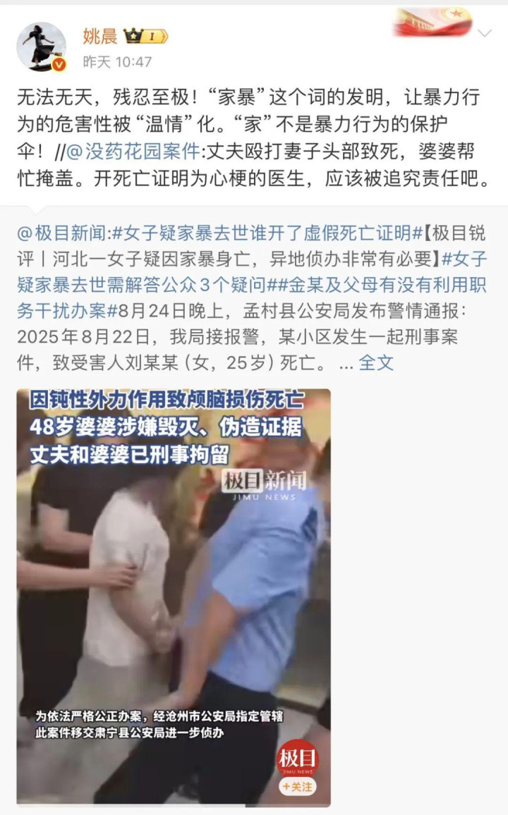 8月25日,演员姚晨针对河北沧州孟村县一女子疑遭家暴致死案件公开发声,以“无法无天,残忍至极”谴责施暴者,并呼吁社会正视家庭暴力的犯罪本质。